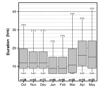 The average duration for all events was 14 h. The highest precipitation rates are most likely to occur between initiation and maximum extent, while the greatest amount of precipitation occurs near the maximum extent.