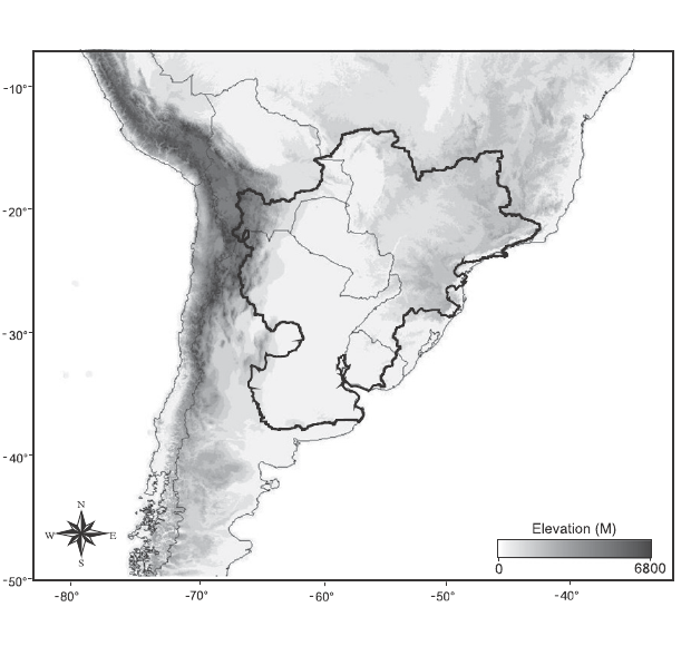 Topographical map of SSA. The perimeter of the La Plata Basin is outlined.