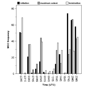 MCC initiation generally occurs in the late afternoon or early evening. The systems reach maximum size around midnight before dissipating the next morning.