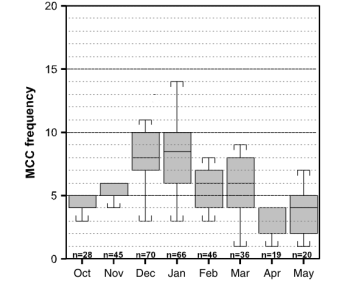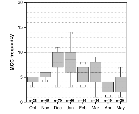 Box-and-whisker plot of warm season MCC frequency by month for the years 1998-2007. The boxes show the interquartile range, the whiskers show the 10th and 90th percentiles and the solid line indicates the median. 'n' is equal to the number of events for a given month.