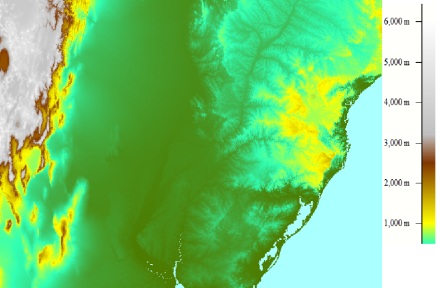 Topographical map of the region where MCC's tend to form. Location between 20°S - 35°S and 70°W - 45°W.