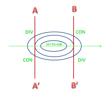 Modelo de Riehl para um núcleo de jato de alto nível e os locais de convergência e divergência que o acompanham.