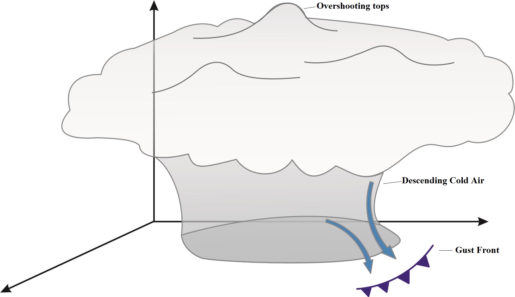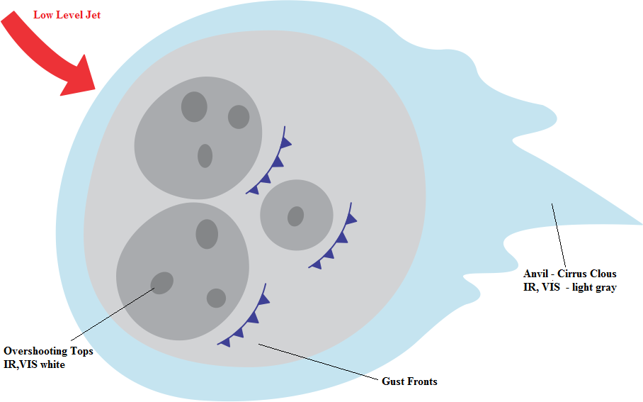 Estágio maduro de um CCM: aglomerado quase circular de tempestades convectivas. O ar frio descendente cria frentes de rajada o redor do aglomerado, especialmente à frente dele.
