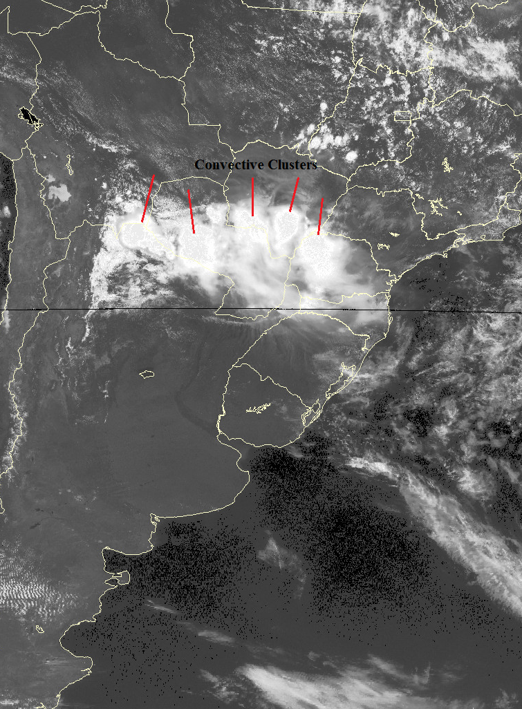 1. Complexos convectivos de mesoescala (CCMs): 1. Normalmente possuem forma circular cobrindo uma extensa área onde se verifica regiões de convecção com baixos valores de temperatura de brilho no IR e alto albedo no VIS. As imagens no VIS frequentemente aparecem saturadas, porém quando vistas em combinação com imagens realçadas no IR é possível identificar o alto gradiente de temperatura nas bordas, e também as partes mais convectivas e ativas do CCM.