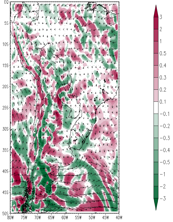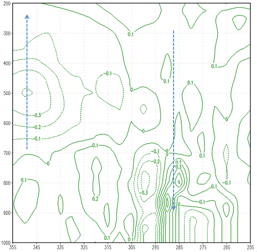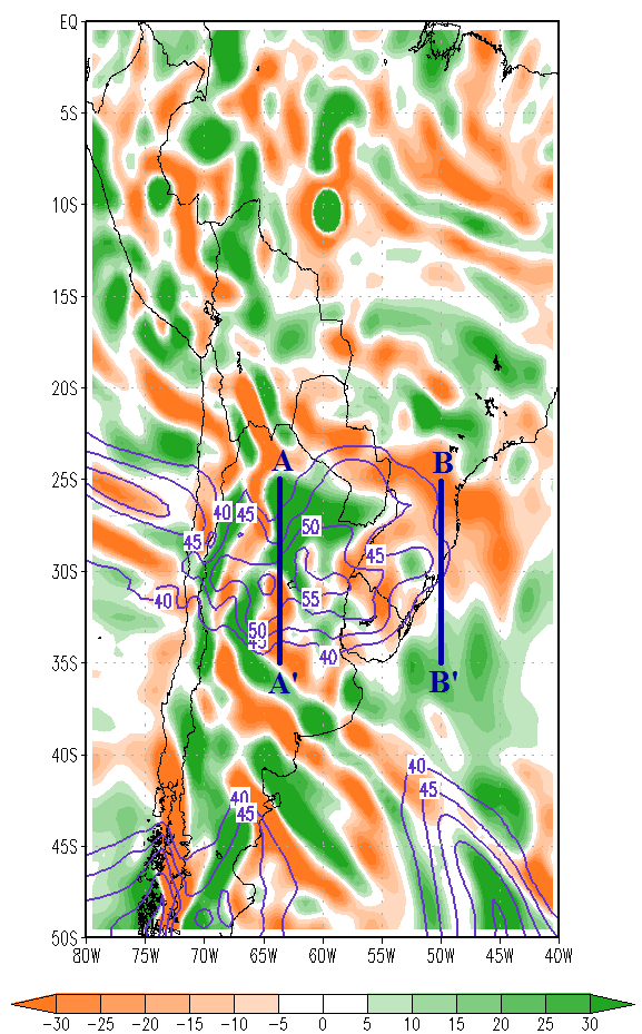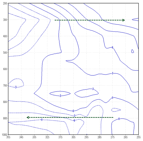 Na seção transversal de velocidades verticais ao longo da linha A-A', ar descendente entre 33°S e 35°S e ar ascendente entre 22°S e 25°S (setas azuis). Na seção transversal de componentes de vento meridional ao longo da linha A-A' a direção do vento é principalmente de sul a norte na troposfera média (seta verde em 500 hPa) enquanto que o jato de altos níveis (linha verde a 250 hPa) e o jato de baixos níveis (linha vermelha a 850 hPa) possuem direção oposta.