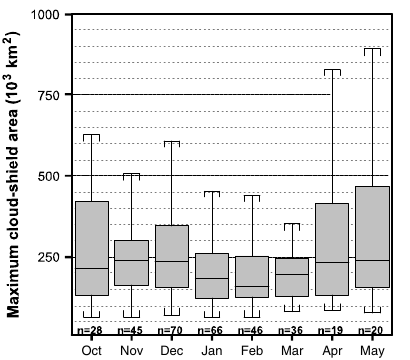 O tamanho médio de todos os 330 CCM durante a extensão máxima era 256 500 km2. Os maiores CCM ocorreram no final da primavera, início do verão e outono, enquanto os sistemas menores ocorreram no final do verão. E a maioria dos CCM tiveram seu ciclo de vida completo dentro de 20°S - 30°S.