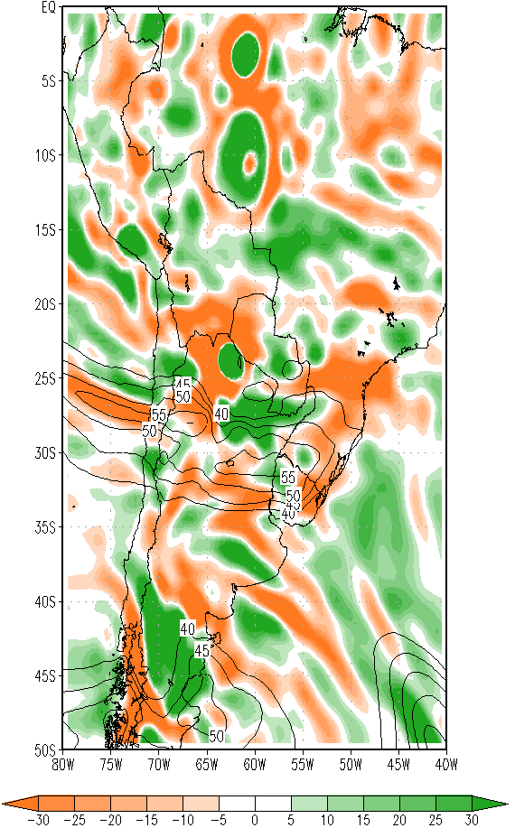 Linhas de fluxo (azul) e isotacas (amarelo) em 200 hPa, junto com o jato de baixos níveis (vermelho). Divergência (10-5 s-1) e isotacas em 200 hPa.