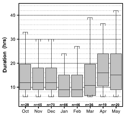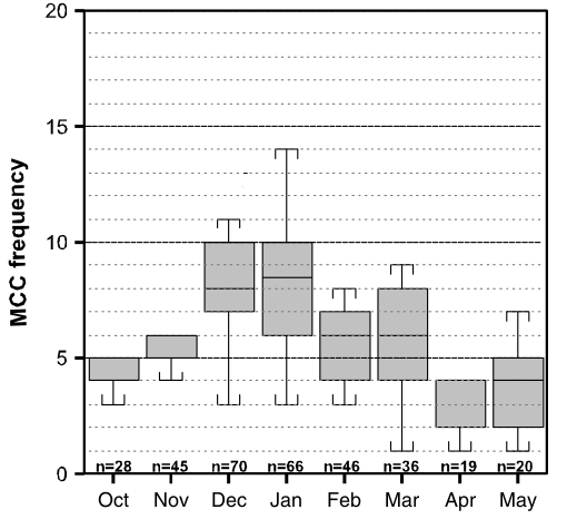 Gráfico "box-and-whisker" da frequência de CCMs nos meses da estação quente no período de 1998-2007. As caixas mostram a faixa de valores dentro dos quartis, as estacas mostram os percentuais de 10 e 90%, e as linhas sólidas indicam a mediana. 'n' é igual ao número de eventos para cada mês. Frequência de CCMs na estação quente (Outubro-Maio) no período de 1998-2007 (N=330), determinado pelo número de vezes no qual os pontos de grade estiveram localizados dentro de um trajeto de tempestade de um CCM.
