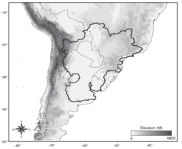 Mapa topográfico da SAS. O perímetro da Bacia da Prata é delineado. Mapa topográfico da região onde CCMs tendem a se formar. Localização entre 20°S - 35°S e 70°W - 45°W.