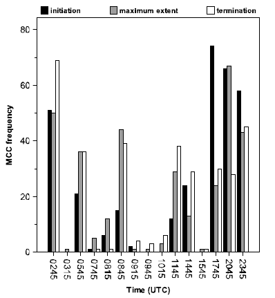 A maior frequência de ocorrência (quase 75% dos casos) para início, extensão máxima e terminação foi observada às 17:45, 20:45 e 02:45 UTC, respectivamente. E a duração média dos eventos foram de 14 horas.