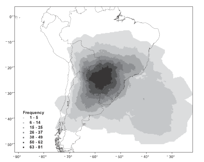As imagens abaixo fornecem informações sobre a frequência de ocorrência e características dos CCM observadas durante o verão austral (definida entre outubro-maio) nos anos entre 1998-2007 por Durkee e Mote (2009). A imagem à esquerda mostra que as frequências mais altas ocorrem entre dezembro e janeiro. Para o período em questão, foram registrados 70 eventos em dezembro e 66 em janeiro. A figura à direita descreve as áreas de frequência de ocorrência do CCM. Os tons de cinza representam o número de casos em que os pontos da grade foram localizados dentro da região do CCM. O Nordeste da Argentina, Paraguai e sudoeste do Brasil são as regiões com maior número de observações de CCM.