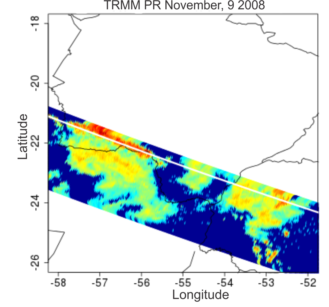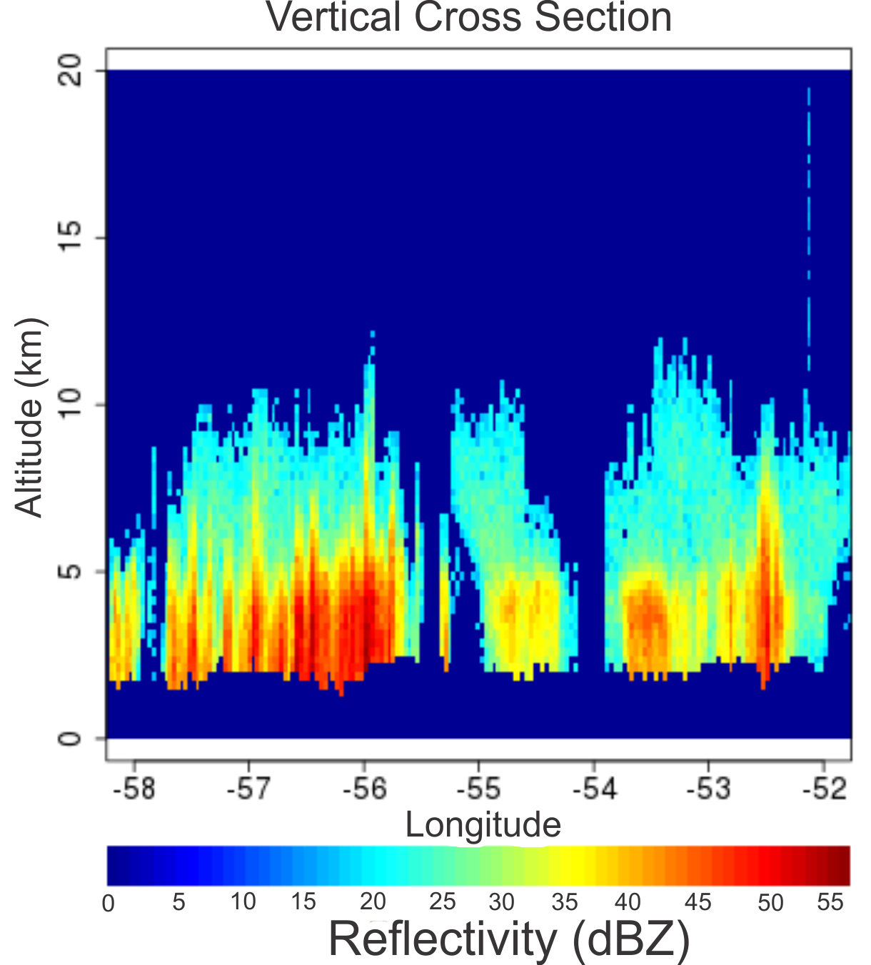 Através dos dados do PR (Precipitation Radar), a bordo do satélite TRMM, é possível analisar a refletividade (designada pela letra Z) que representa a quantidade de energia retro-espalhada pelo alvo e novamente detectada pelo radar. Abrange uma ampla taxa de sinais. Os valores dBZ (decibéis de Z) aumentam a medida que o sinal recebido pelo radar aumenta.