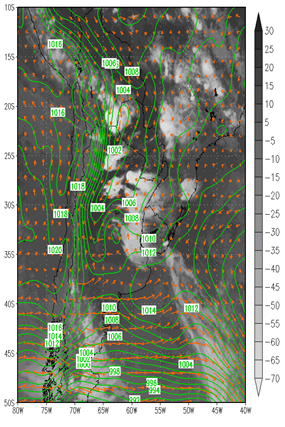 Desenho esquemático da situação sinótica na formação e desenvolvimento de CCM com presença do Jato de Baixos Níveis (JBN), Baixa do Nordeste da Argentina e a passagem de uma frente fria no sul da América do Sul. Pressão média no nível do mar (hPa) e vento em 850 hPa (m/s) sobreposto à imagem GOES 11.0 IR em 9 de Novembro, 2008 às 06:00 UTC.