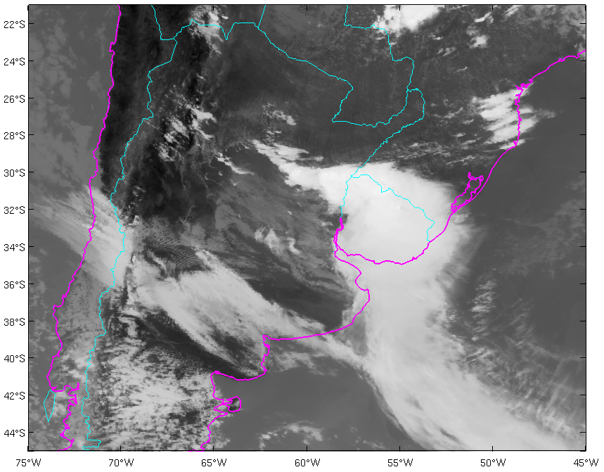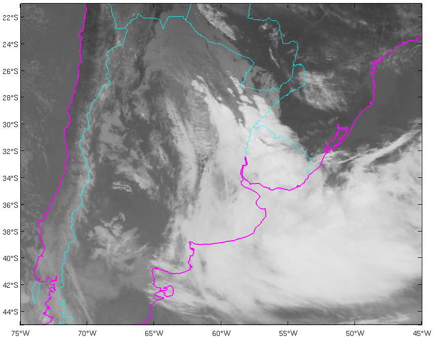 La siguiente animación muestra el pasaje de un frente frío el día 22 de Agosto de 2013. En este caso, puede verse que el frente frío llega más al norte que en verano, alcanza hasta Paraguay y Bolivia, desencadenando la convección profunda alrededor de 00 UTC del 23 de agosto.