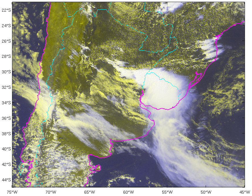 - RGB: la ventaja de estas imágenes es que permiten identificar diferentes tipos de nubes fácilmente. En colores amarillos se destaca la nubosidad de niveles bajos. La nubosidad con mayor desarrollo vertical se observa en tonos blancos, más brillantes, mientras que los cirrus translúcidos de niveles altos se presentan en tonalidades azuladas.