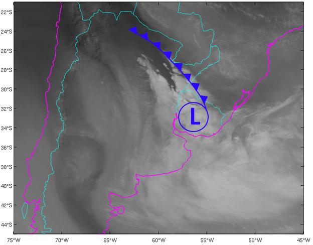 La siguiente animación muestra el pasaje de un frente frío el día 6 de Febrero de 2014. Se observa como el frente frío alcanza a la Argentina desde el Pacífico sur y se mueve rápidamente al el este hacia el Océano Atlántico.