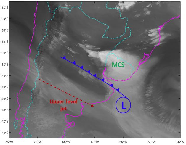 Hay densas nubes convectivas por delante de los frentes fríos de verano, generalmente debido a la ocurrencia de Sistemas Convectivos de Mesoescala (MCS) en presencia del Jet Sudamericano de Capas Bajas (SALLJ)