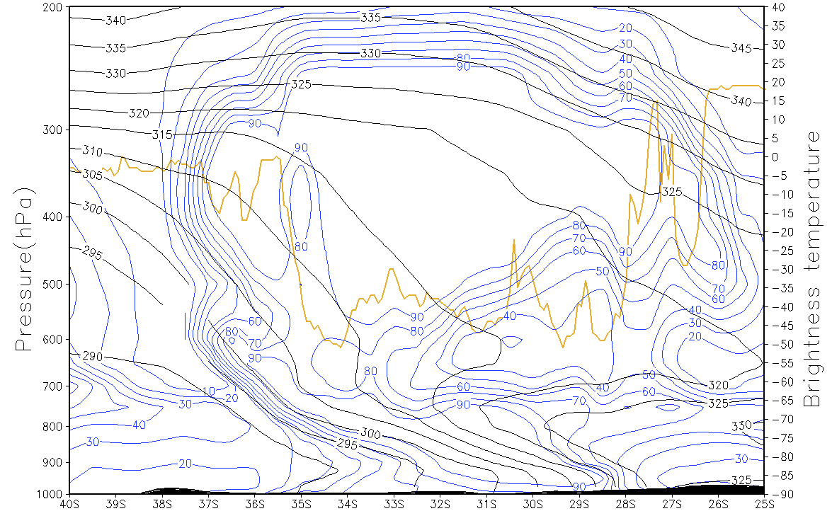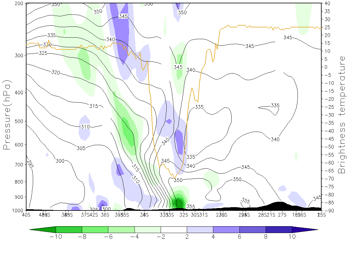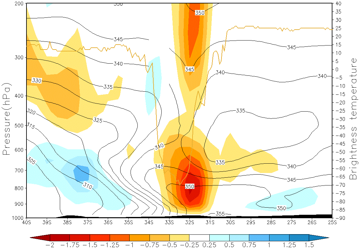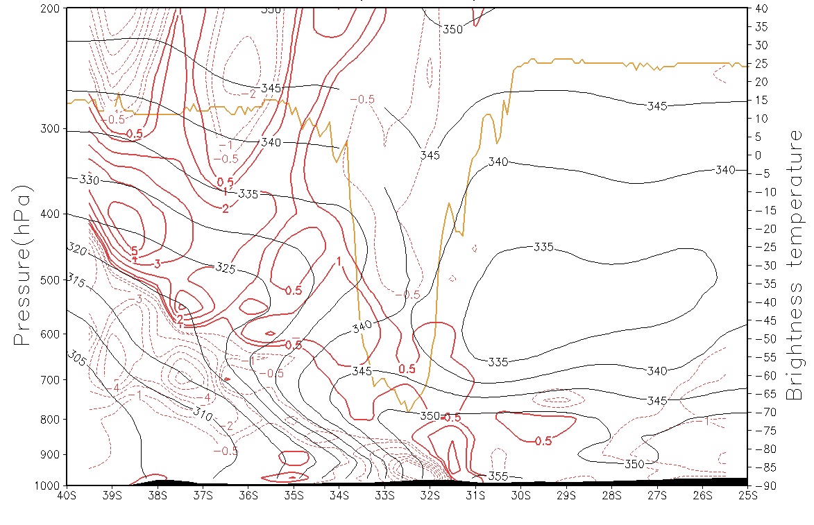 Lon: 63°W. Temperatura potencial equivalente (K) en negro, advección de temperatura en rojo (10 -4 °C/seg) y temperatura de brillo en amarillo (°C) - 10 Sep 2015 00UTC.