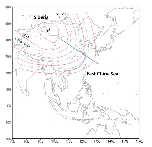 The first sign of NCS initiation is rise of the mean sea level pressure to over 1045 hPa in northern China. After that, the pressure continues to rise southeast of it. When a 10 hPa pressure gradient between Hong Kong and 30°N, 115°E is detected, it indicates the arrival of a NCS in Hong Kong.