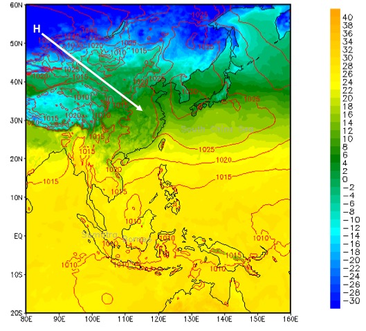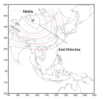 Cold advection associated with NCS occurs along the coastline of southern China.