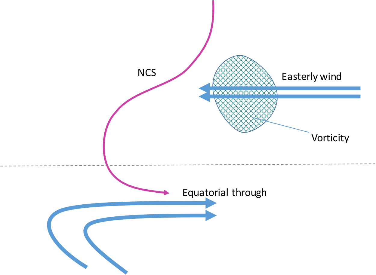 Strong zonal winds from opposite sides of equator may help in building a vortex. The Borneo vortex exists in 60 % of NCS cases.