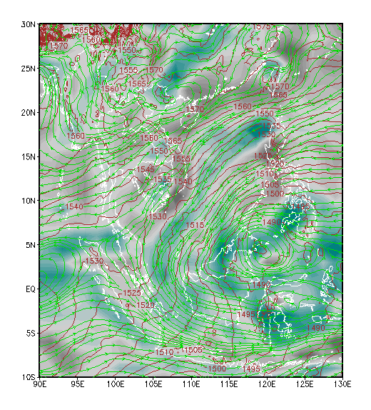 Brown: Geopotential height (m); teal: Vorticity ; green: Streamlines at 850 hPa |