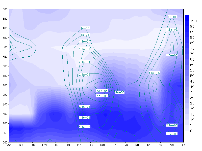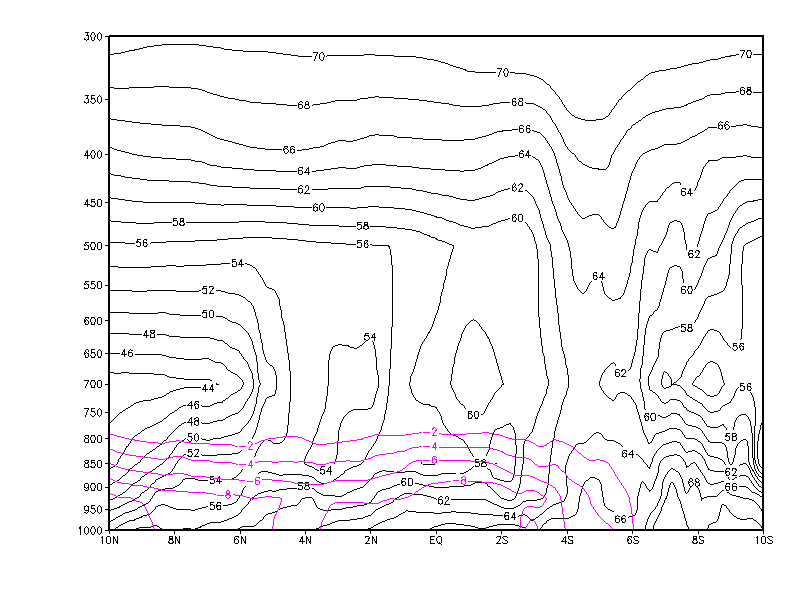 This animation shows a time-latitude cross section of the propagation of meridional track wind and relative humidity during an NCS event.