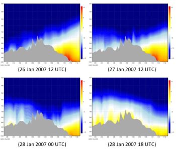 Press "Play Button" to see the loop; 25 Jan 2007/00 UTC - 09 Feb 2007/18 UTC Vertical Cross Sectio: Top: Along track Wind Speed (m/s); Bottom: Relative Humidity (%). |