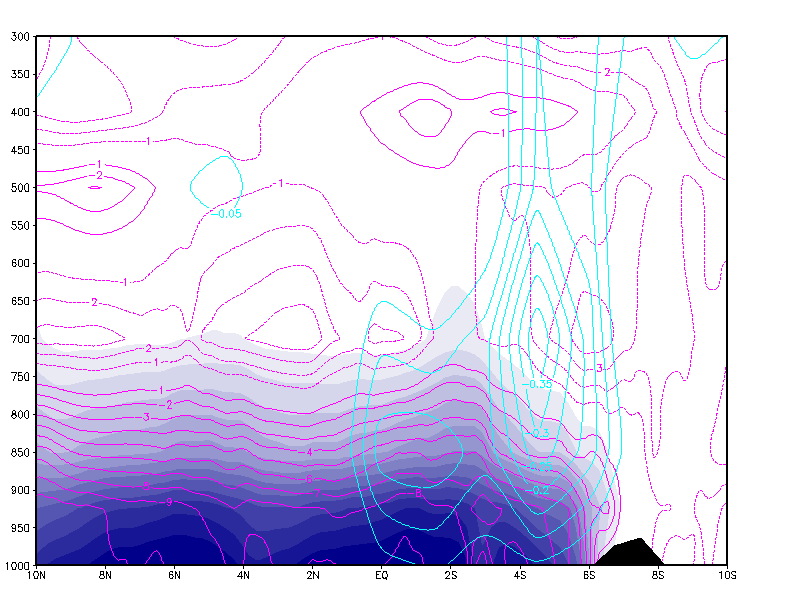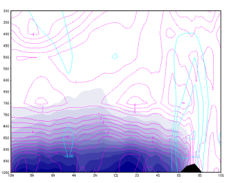 Cyan: vertical motion (pa/s); shaded: meridional moisture transport (g/kg*m/s), magenta: meridional wind (m/s). 31 Jan 2007, top: night time, bottom: day time |