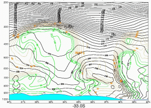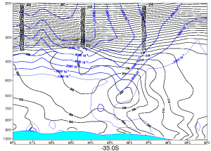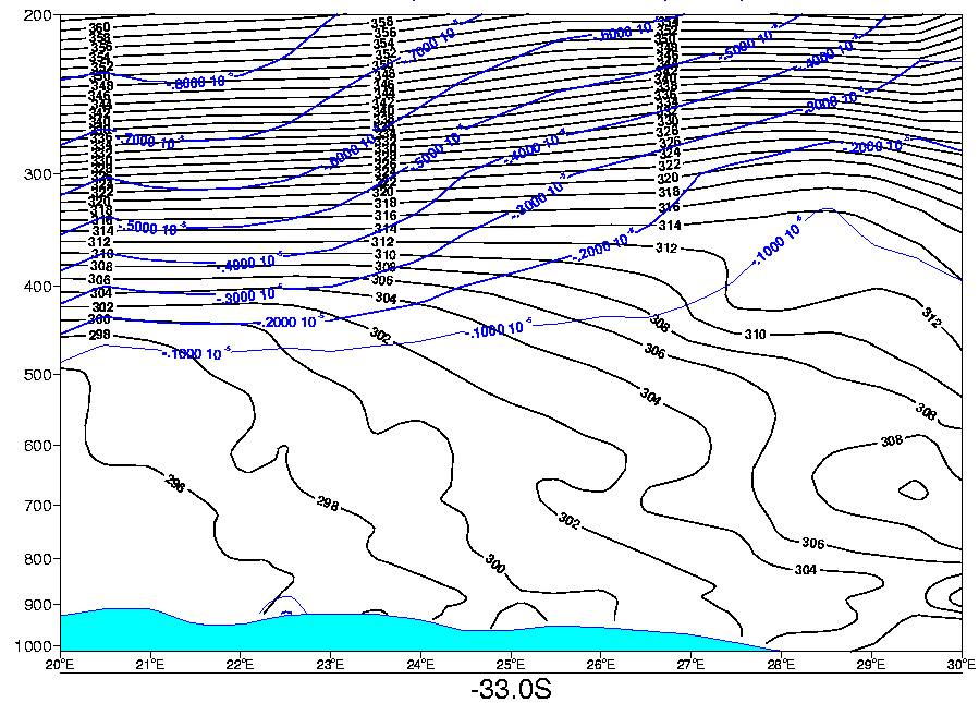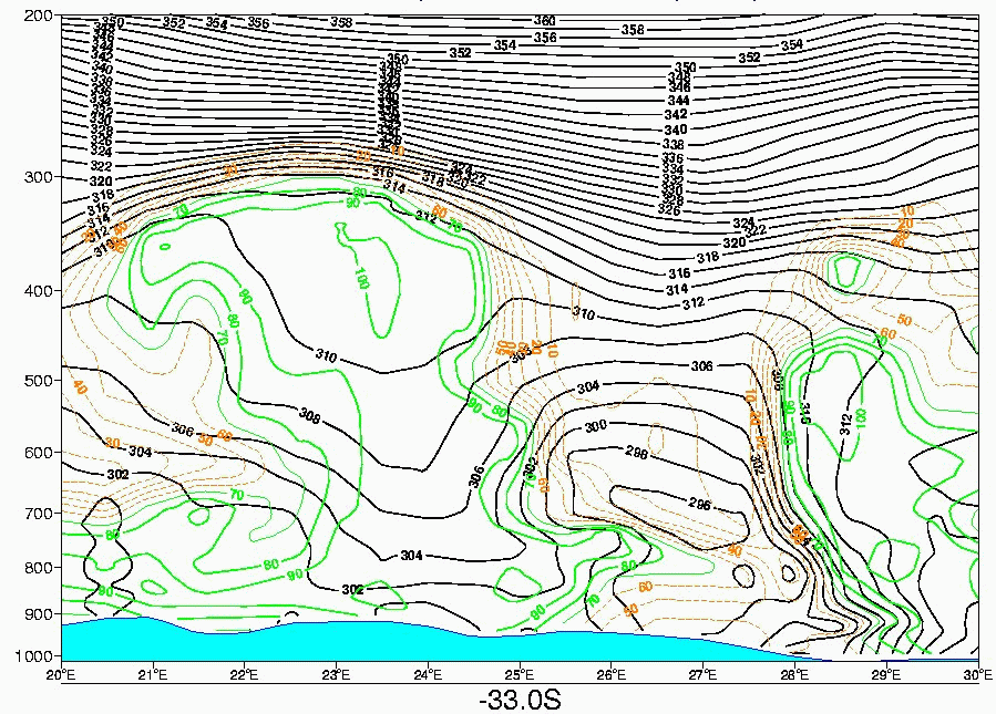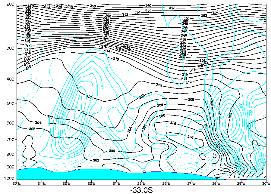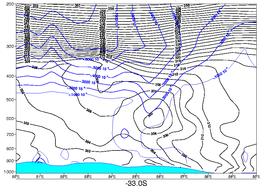 All vertical cross sections below were done on a constant latitude line of 33deg south, and between 20deg East and 30deg East in longitude. an example is given below.