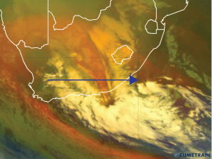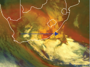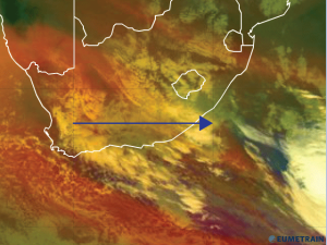 The depth of highest values of Relative humidity is found between 23 and 24° East, extending from the surface until nearly 300hPa. this area of deep moisture is located west of where the COL is extending to the mid levels of the atmosphere, as seen in the potential vorticity field above. The dry area seen in the relative humidity field, between 26 and 28° East, is coincident with where the surface low pressure system is located in the satellite imagery.