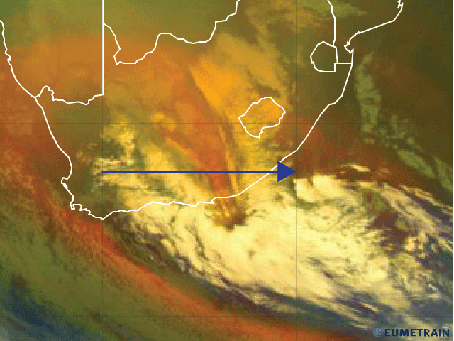 Maximum uplift is found between 500hPa and 600hPa at a longitude of 22° east. in this area, the uplift extends from the surface, vertically to above 300hPa. such a deep zone of uplift is very favourable for convective development. a similarly deep zone of uplift is fund off the east coast of South Africa, at 31deg East, and is coincident with the broad band of convective cloud seen on the satellite imagery, east of the COL. the zone of uplift coincides well with where the deepest layer of relative humidity is found, as well as being east of the zone of negative values of PV which are extending to the surface, over the eastern parts of South Africa.