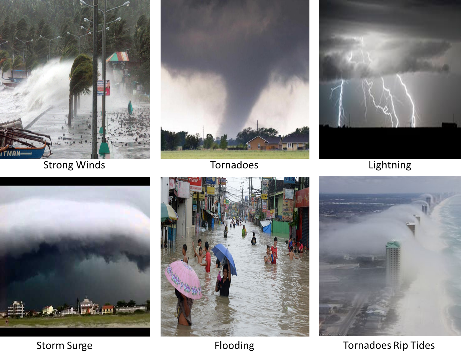 | Storm Surge | A storm surge is a the rising of the sea level due to the low pressure, high winds, and high waves associated with a TC when it makes landfall. Storm surge can cause significant flooding and even loss of life if people are caught unexpected. The eyewall is where the greatest wind speeds are found, air rises most rapidly, clouds reach their highest altitude, and precipitation is the heaviest. The height of a storm surge varies according to the intensity of a TC, typically ranging from 1 meter to more than 5 meters. Coastal towns adjacent to large bays or areas of shallow water are especially susceptible to damage caused by storm surges. This damage can be further intensified if the storm surge coincides with a high astronomical tide. |