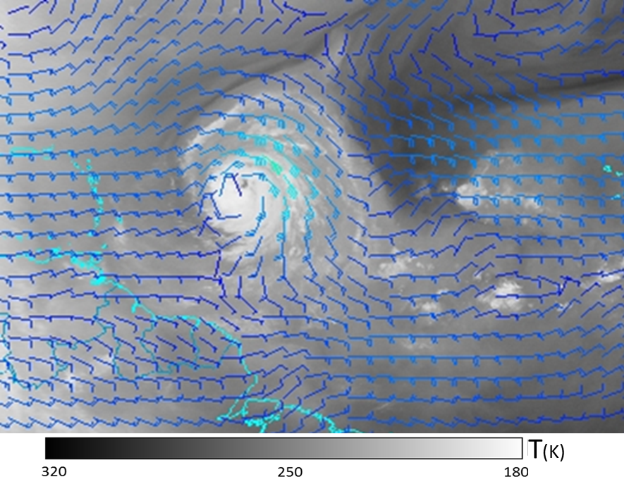 18 Agosto 2009 / 12 UTC. Composição da imagem WV Meteosat-9 WV com linhas de fluxo em 500 hPa GFS do CT Bill (2009). 18 Agosto 2009 / 1200 UTC.Composição da imagem WV Meteosat-9 WV com ventos em 500 hPa GFS (velocidade e direção) do CT Bill (2009).