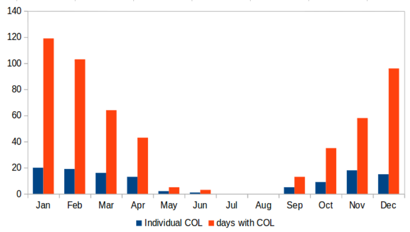Number of individual UTCVs (whole life cycle) observed using WV satellite imagery and the number of days with UTCVs (source: Coutinho, 2010).