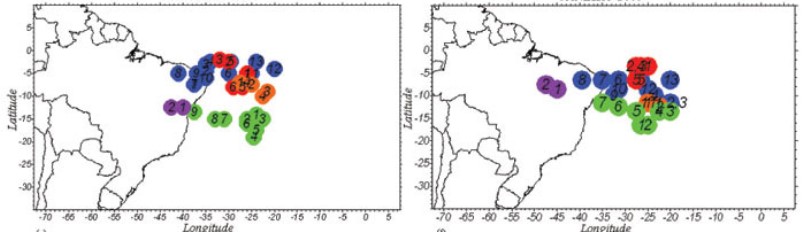 Path of the 200 mb cyclone during January 2003. The colored cycle represents the UTCVs and the numbers indicate the sequence of 12 hours. The figure on the left shows the formation time and that on the right shows a period twelve hours later. Source: Coutinho (2010).