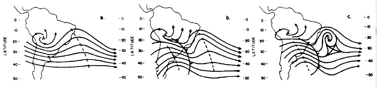 Schematic sequence for the formation of a 200 hPa subtropical cyclone in the South Atlantic. Source: Kousky and Gan (1981).