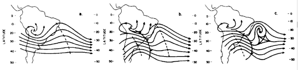 In many cases, the genesis of a UTCV is associated with cold frontal systems, penetrating from high latitudes to low latitudes. Strong low and mid-level warm advection precedes the active cold front. This warm advection then amplifies the upper-level ridge downstream, which contributes to the amplification of the downstream trough located over northeastern Brazil and the Atlantic Ocean. The vortex formation mechanism was proposed by Kousky and Gan (1981) and is schematically illustrated below. Figure (a) shows the typical summer circulation pattern over South America and the South Atlantic (200 hPa). Figure (b) shows an active mid-latitude, upper-level trough over South America, its associated surface-level cold front in southern Brazil and a strong upper-level ridge, extending from southeastern Brazil out, over the Atlantic. A sharpening of the trough pattern can be seen over the western Atlantic region. Finally, the cold front moves over southeastern Brazil and a UTCV forms in the western Atlantic.