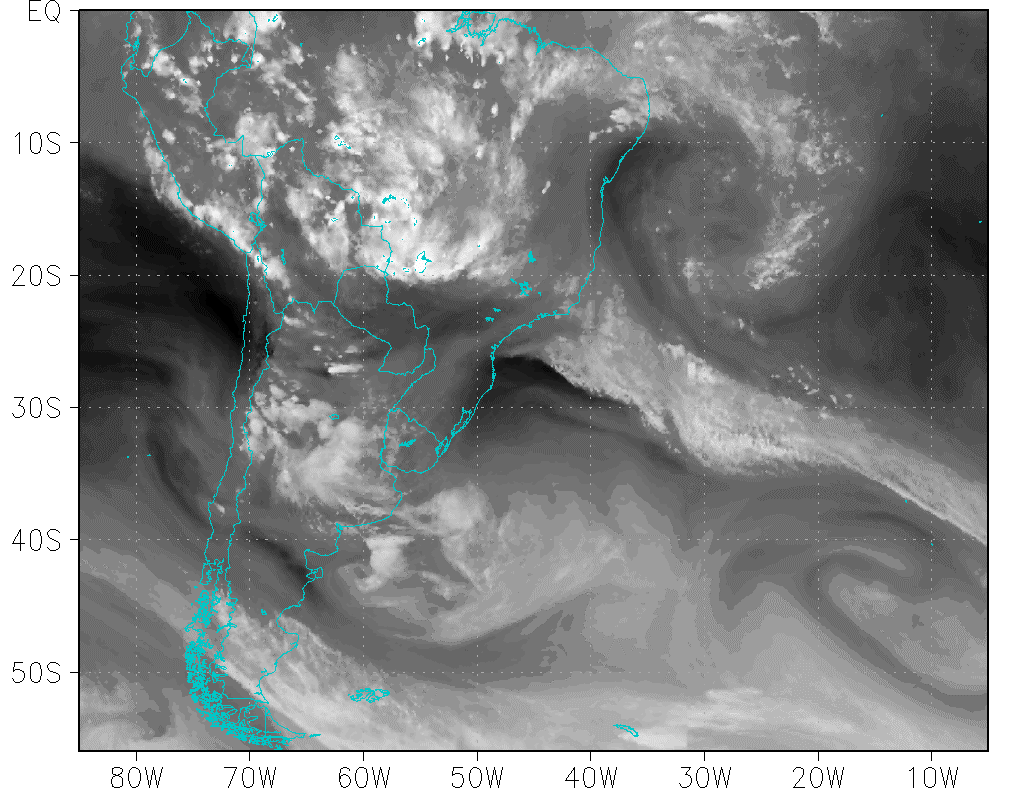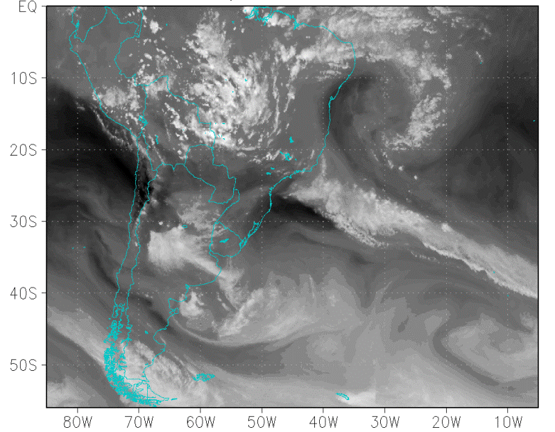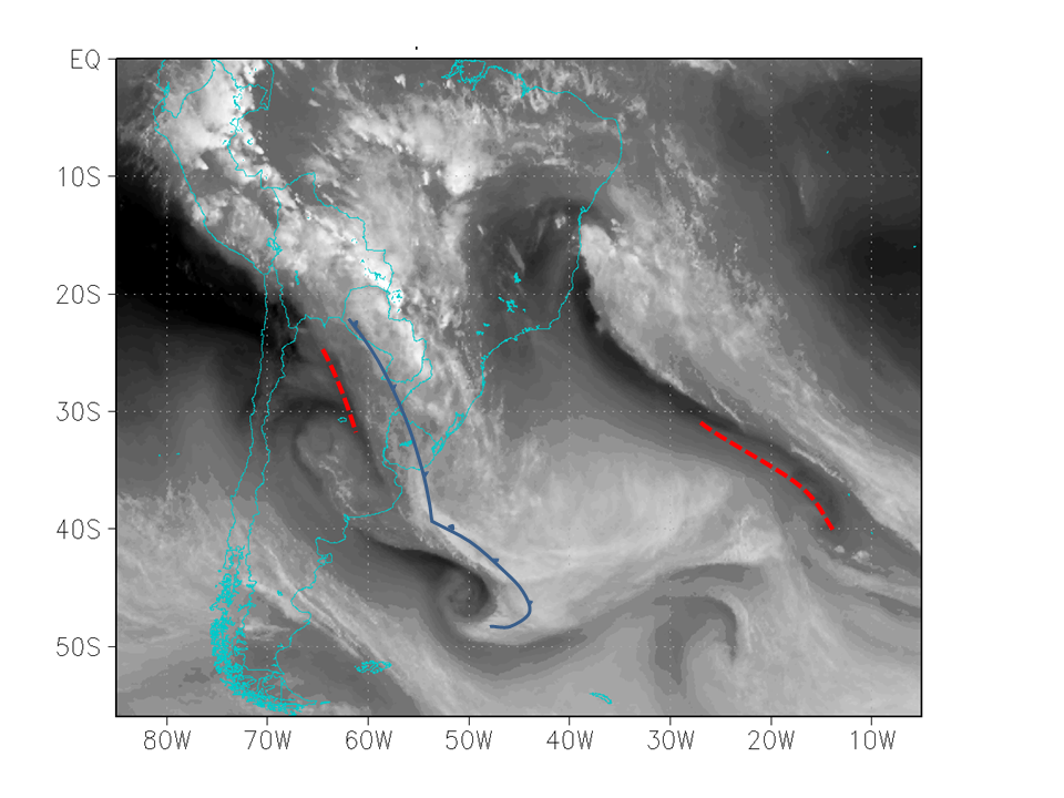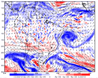 In the figure below, we can see an area of minimum relative vorticity in the center of the UTCV. Over southeastern Brazil, we can also identify an area of maximum (positive) relative vorticity, in association with the upper-level ridge downstream of the frontal trough.These two areas form a dipole.