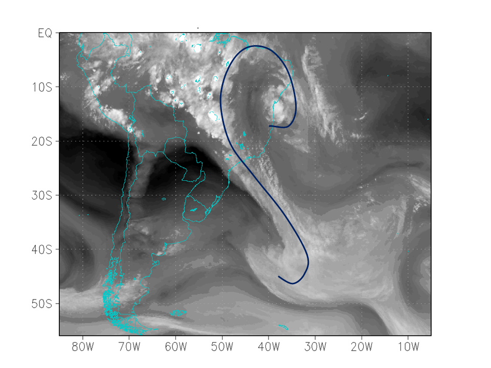 We can also see the presence of an anticyclonic circulation (Bolivian High) over the continent, which contributes to diffluence and divergence at upper levels between this high and the UTCV. Convective clouds then form in this region, in association with this divergence.