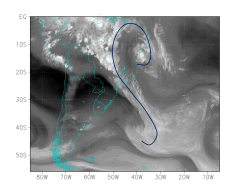The cloud patterns associated with UTCVs vary considerably, depending on their intensity and depth. At mid and upper levels, we often see these cloud patterns form in connection with situations such as those in the figures (schematic and IR image) below. Here we can see that the cloud structures associated with the UTCV have merged with those of the extratropical low pressure and frontal system, to produce an "S" shape. In some case, convective clouds in the western sector of the vortex will interact with the circulation from the Bolivian High.