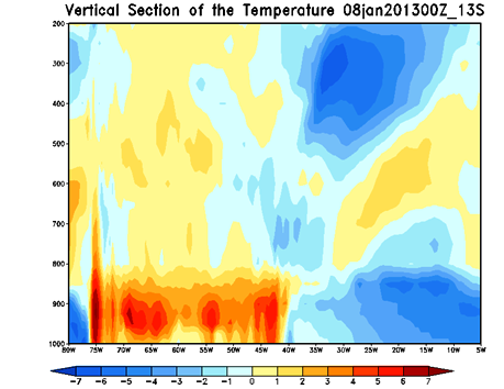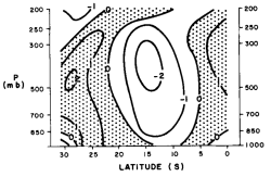 North-south vertical cross section of temperature deviations from longitudinal mean values for 12 March 1978 at 40°W longitude. A longitudinal mean temperature for each level was calculated first. Unit: °C. Source: Kousky and Gan (1981).