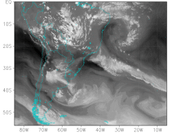 In many cases we can observe an anticyclonic circulation (Bolivian High) over the continent, which contributes to diffluence and divergence at upper levels, between this high and the UTCV. Convective clouds and intense preciptation may then develop in assocation with the upper-level divergence in this region. At the center of the vortex, cold, dry air in the upper levels (200-500 hpa) and the positive omega (downwards motion) suppresses most precipitation. However, isolated showers may still be observed near the center of the system, due to an additional, local circulation when the system is over the continent. |