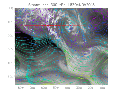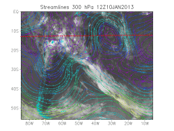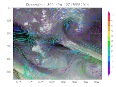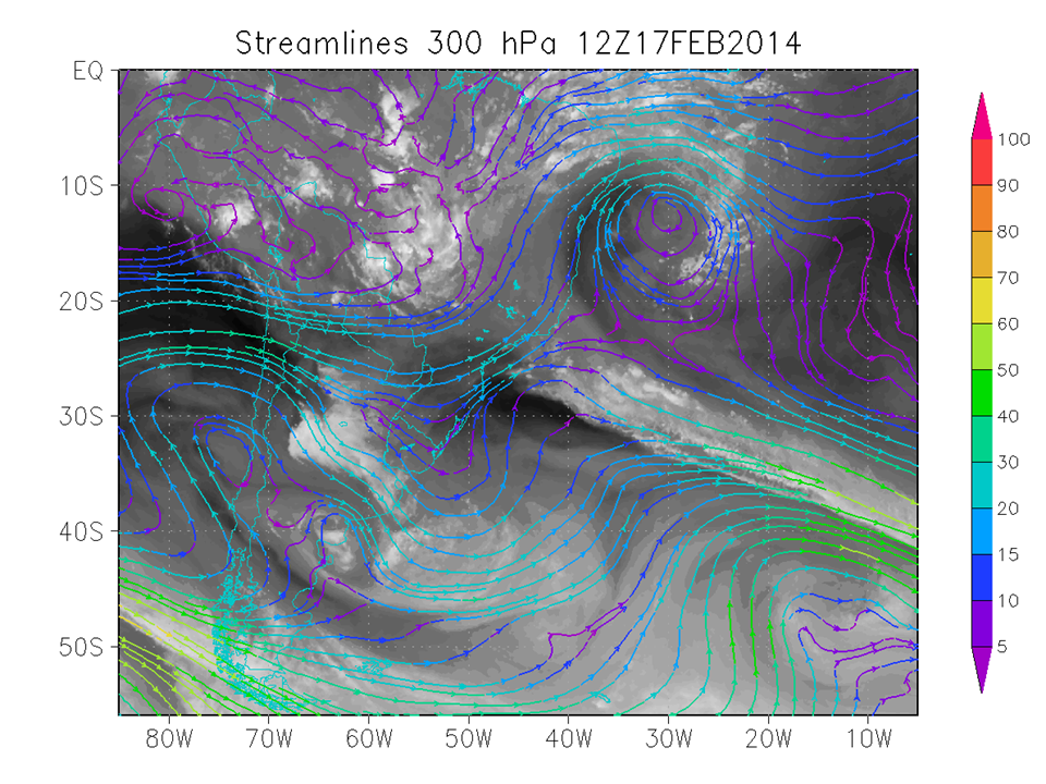 17 February 2014 / 1200UTC. GOES water vapor image and streamlines at 300 hPa (colored vector).