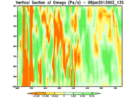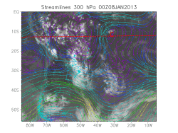 08 January 2013 / 0000 UTC. Infrared satellite image with 300 hPa streamlines (a), vertical cross- section at 13°S for relative vorticity (b), zonal deviation of temperature (c) and vertical velocity (d).