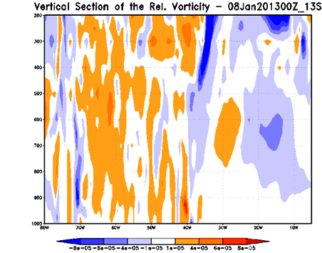 The west-east vertical cross-section of relative vorticity through the cyclone center (13°S) has been compiled while the UTCV was over the coast of northeastern Brazil. We see cloud patterns at the periphery and convective activity in the core. The UTCV extends from the tropopause to 750 hPa, with a small vertical inclination towards the east, from 600 hPa to 300 hPa (b). As expected, this UTCV is deeper than the previous one, with upper cirrus clouds.