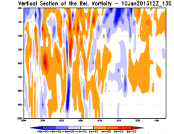The second set of figures shows the same system during its mature stage. The west-east vertical cross-section of relative vorticity through the cyclone center (13°S) has been produced while the UTCV is over the Atlantic Ocean. Cloud structures in the north-eastern sectors show how the UTCV extends from the tropopause to 350 hPa with a vertical inclination towards the east (b).