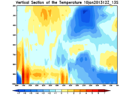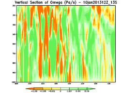 10 January 2013 / 1200 UTC. IR image with 300 hPa streamlines (a), vertical cross-section at 13°S for relative vorticity (b), zonal deviation of temperature (c) and vertical velocity (d).