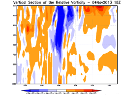 4 November 2013 / 1800 UTC. Water Vapour image (a) and vertical cross section at 18°S for relative vorticity (b), zonal deviation of temperature (c) and vertical velocity (d).