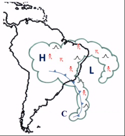 Schematic of weather events associated with UTCV: H and L represent the mean position of high and low pressure systems at high levels. Convective clouds (sometimes associated with high volumes of rain) are observed over the continent, while clear skies, associated with dry and sinking air, are observed at the center of the system.